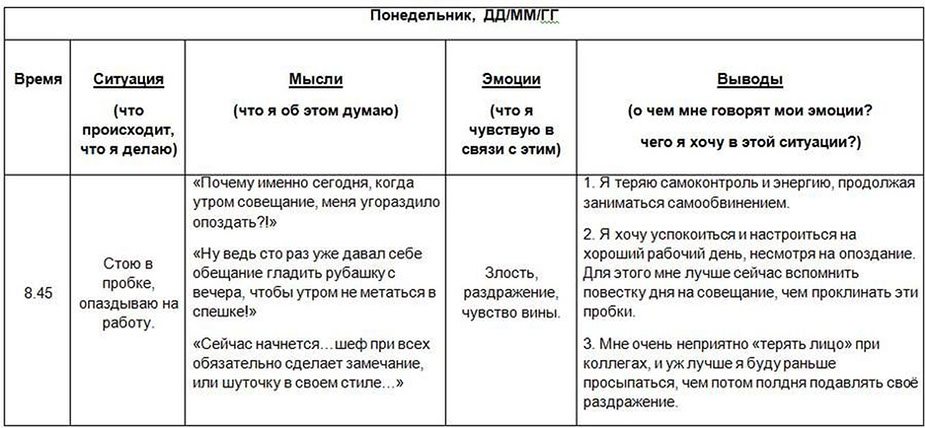 При регулярном ведении “Дневника эмоций” через некоторое время у вас вырабатывается навык самопонимания и эмоционального самоконтроля. Кроме того, само по себе ведение такого дневника делает ваше эмоциональное состояние более стабильным и позитивным.